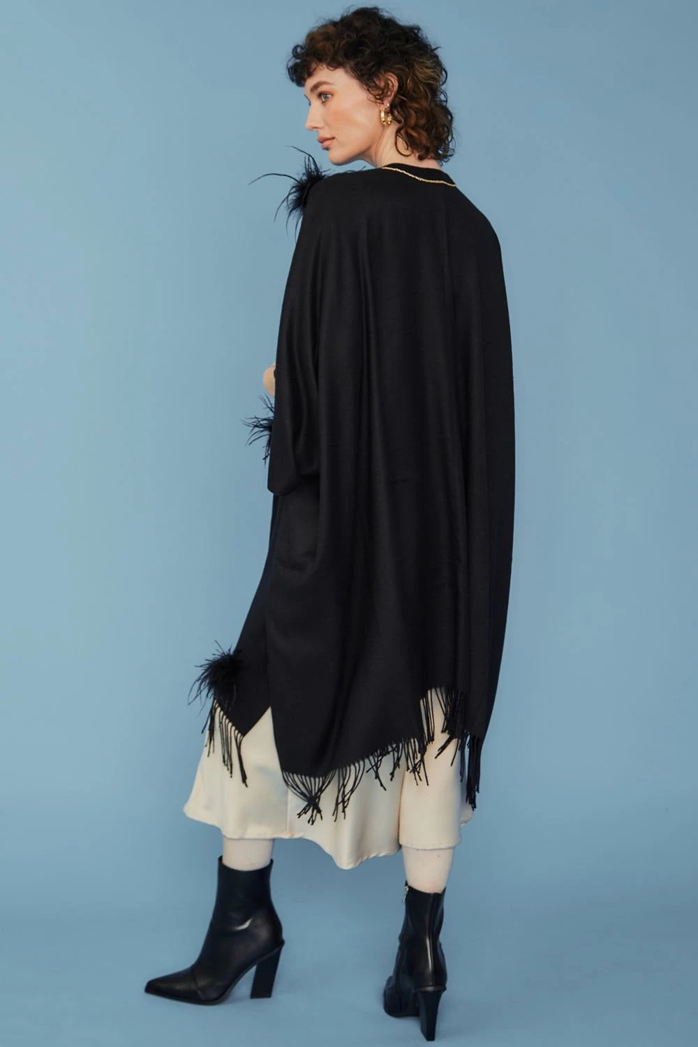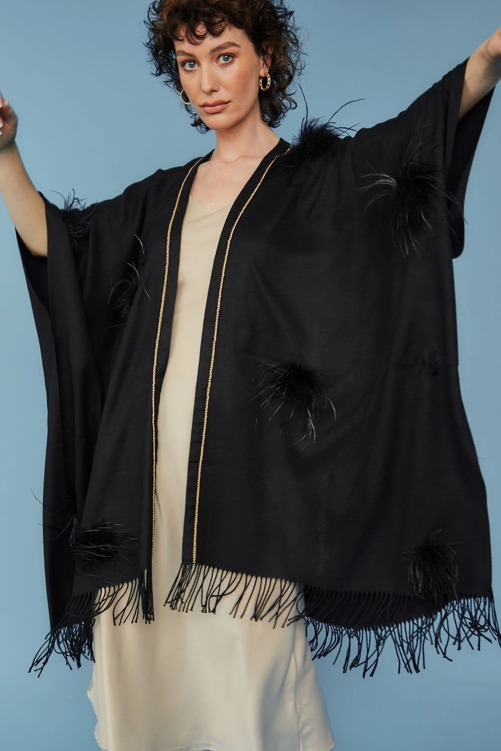 Envelop yourself in luxury with our cashmere blend wrap featuring statement feather embellishments and gold chain trim, the perfect addition to any outfit.