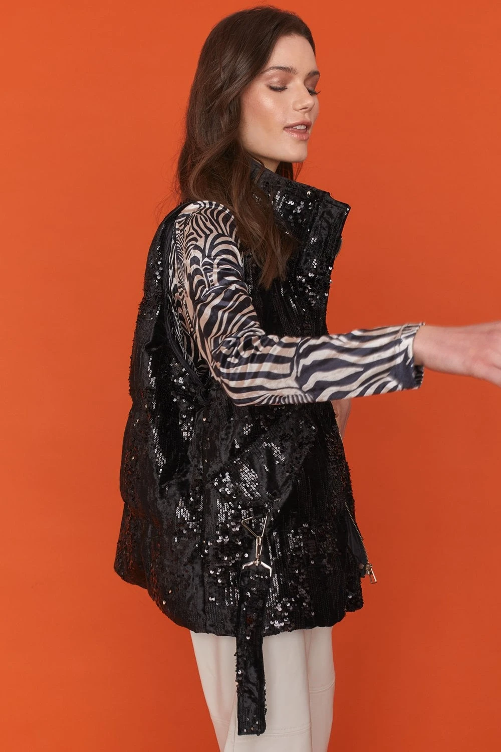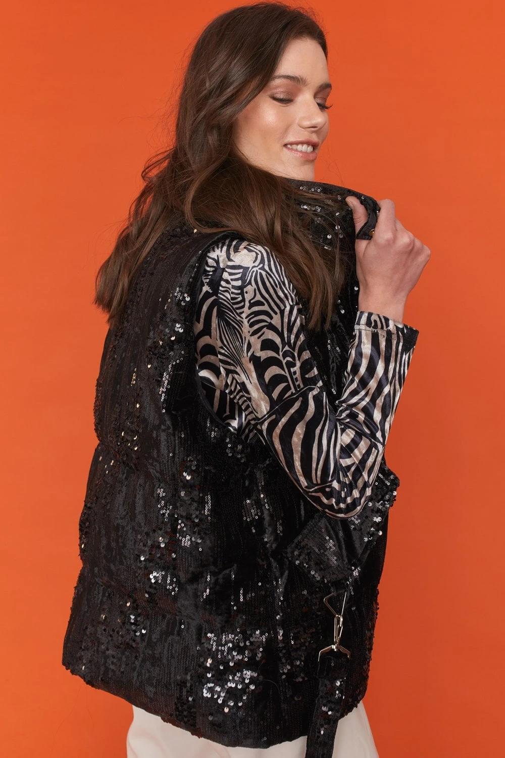 Sequin ribbed texture will elevate all your day-to-night looks! Cropped length with zip and press stud fastening. We just love how this instantly adds sparkle to your outfit!