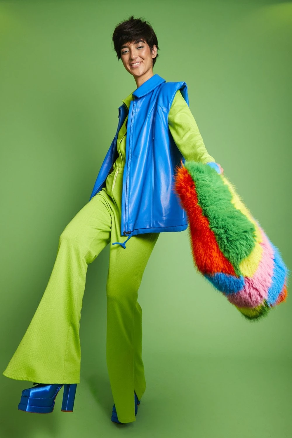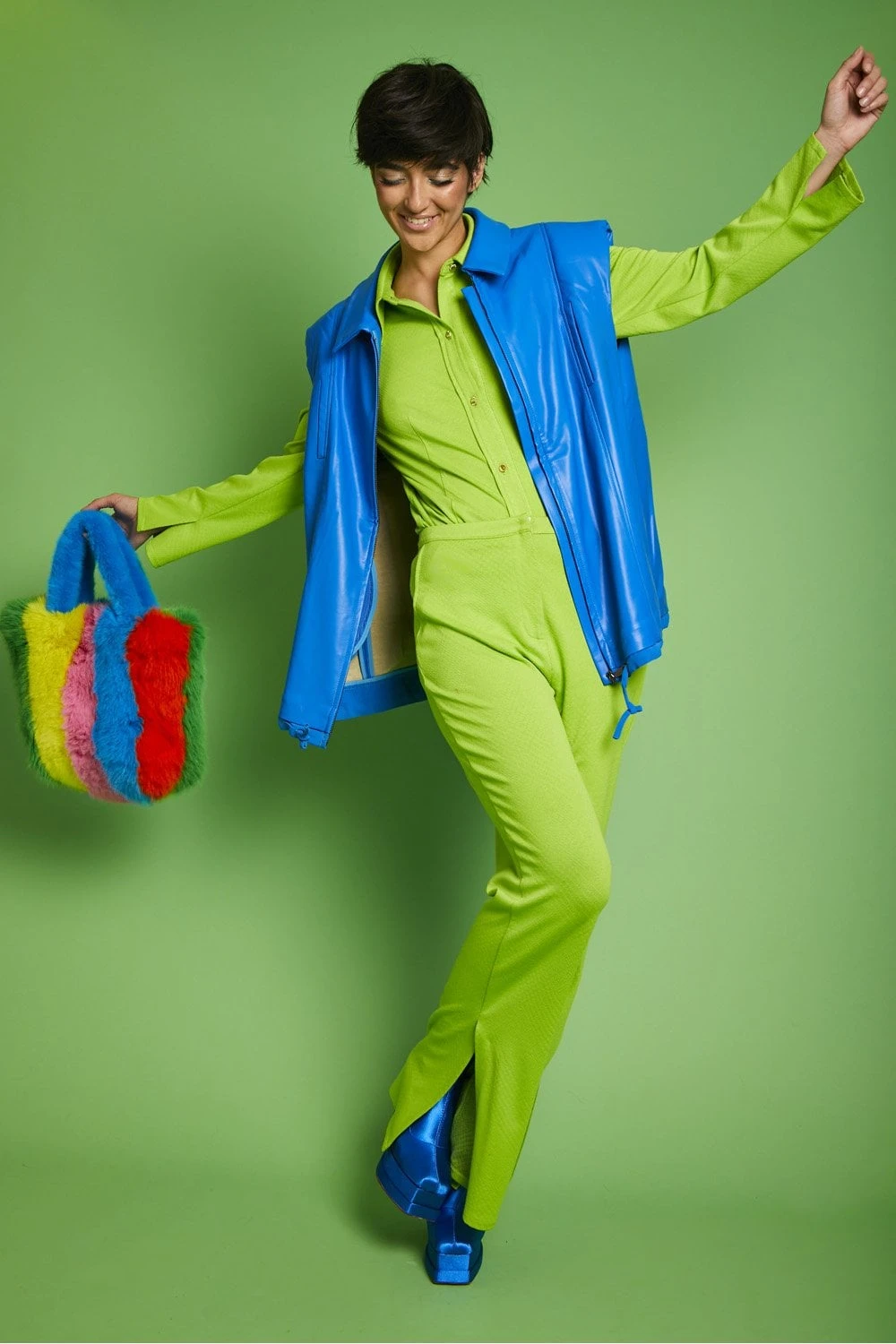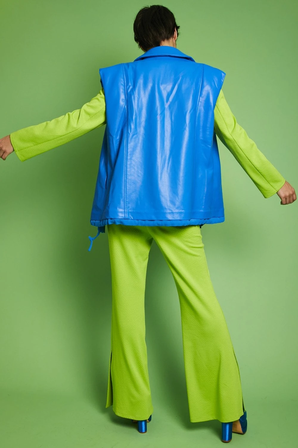 Gilets are a staple piece this Spring Summer and this blue eco-leather gilet has been a hit. Featuring classic lapels, zip fastening, and pockets.