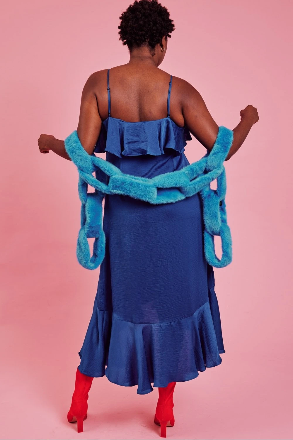 Elevate your outfit with our super soft blue faux fur scarf is the perfect way to add a pop of colour to your outfit, featuring a unique chain detailing.