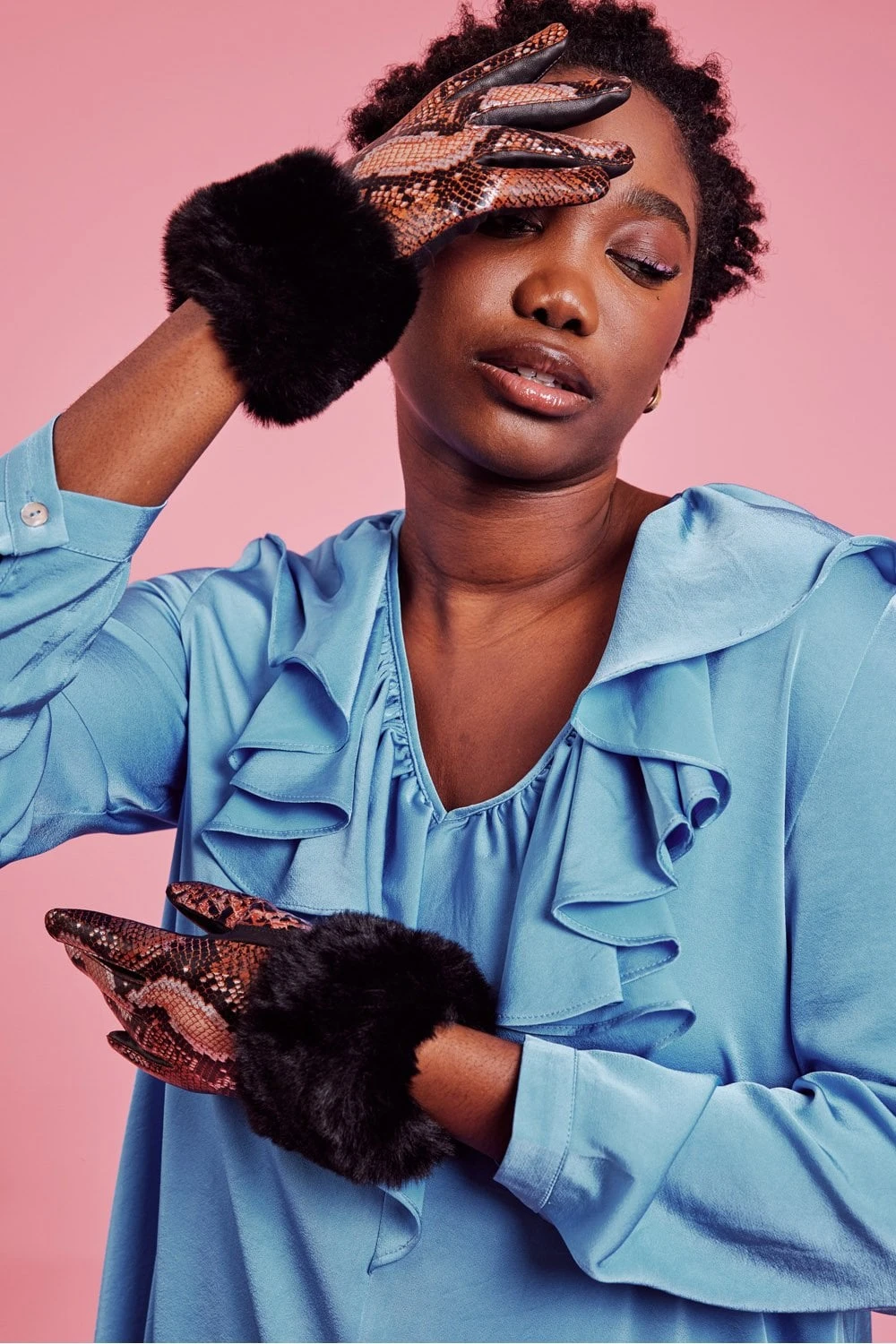 Practical yet exceptionally stylish, these real leather chocolate brown snake print gloves with black faux fur cuff are the epitome of classic design with an edge.
