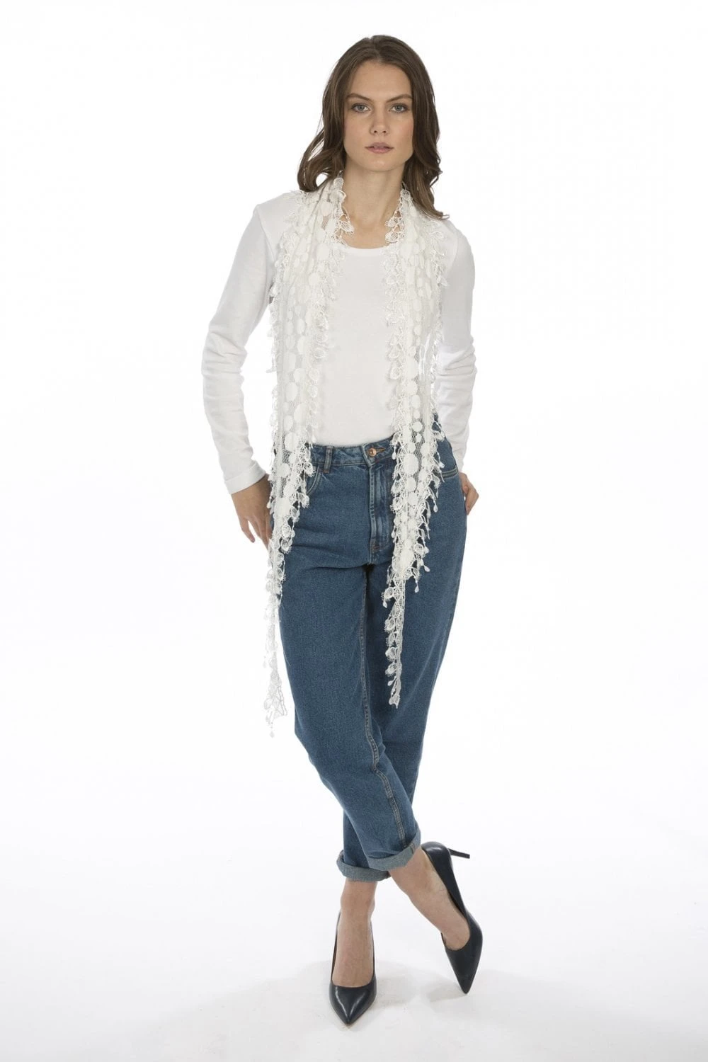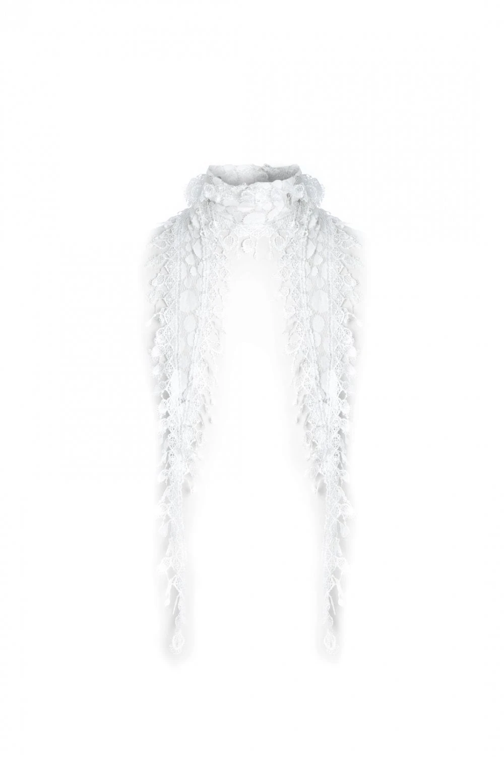 Soft triangular skinny Jayley lace scarf with decorative edge and lace pattern – can be worn wrapped around or just behind the neckline.
