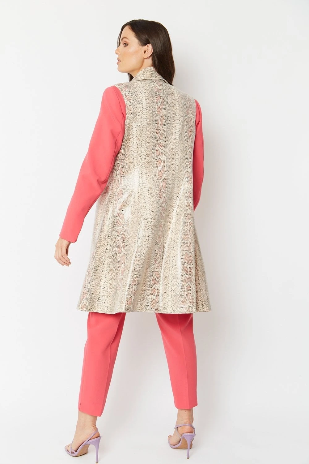 This faux suede waistcoat is cut to a flattering mid-length and boasts a classical cut shape with peaked lapels. Featuring a subtle snake print design, this gilet is ideal for this season as it’s not only lightweight but water resistant too. Just in case you get caught in a shower.