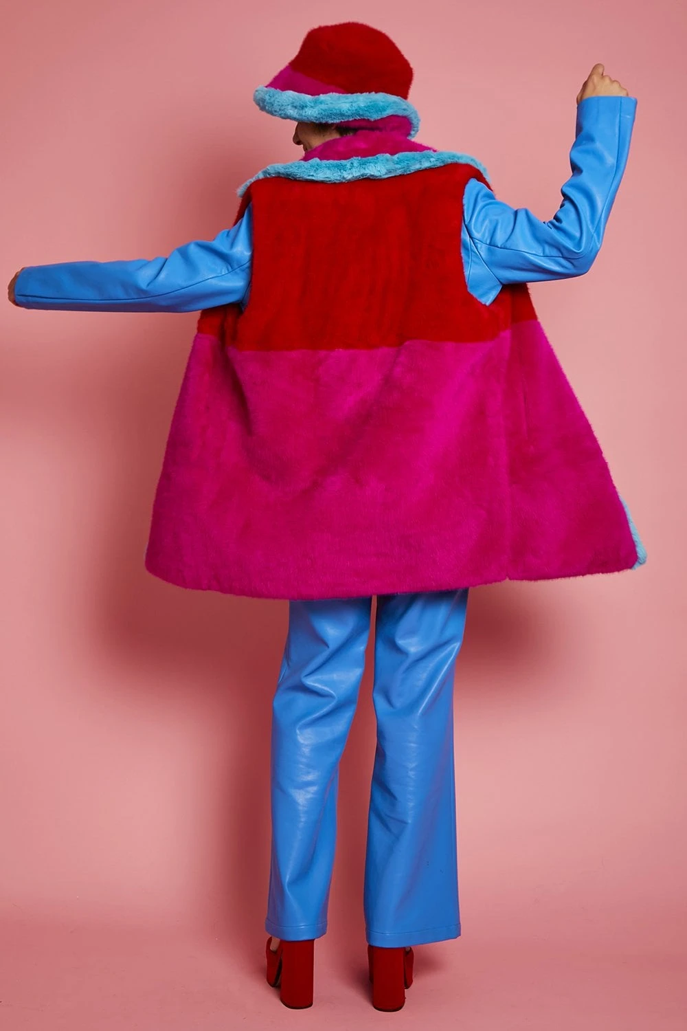 Add a touch of vibrant colour to your look with this gorgeous faux fur gilet with a classic collar. In a patchwork style, this gilet features 3 bold tones including an electric blue to brighten the front outline of the design. This coat has button front fastening and pockets.