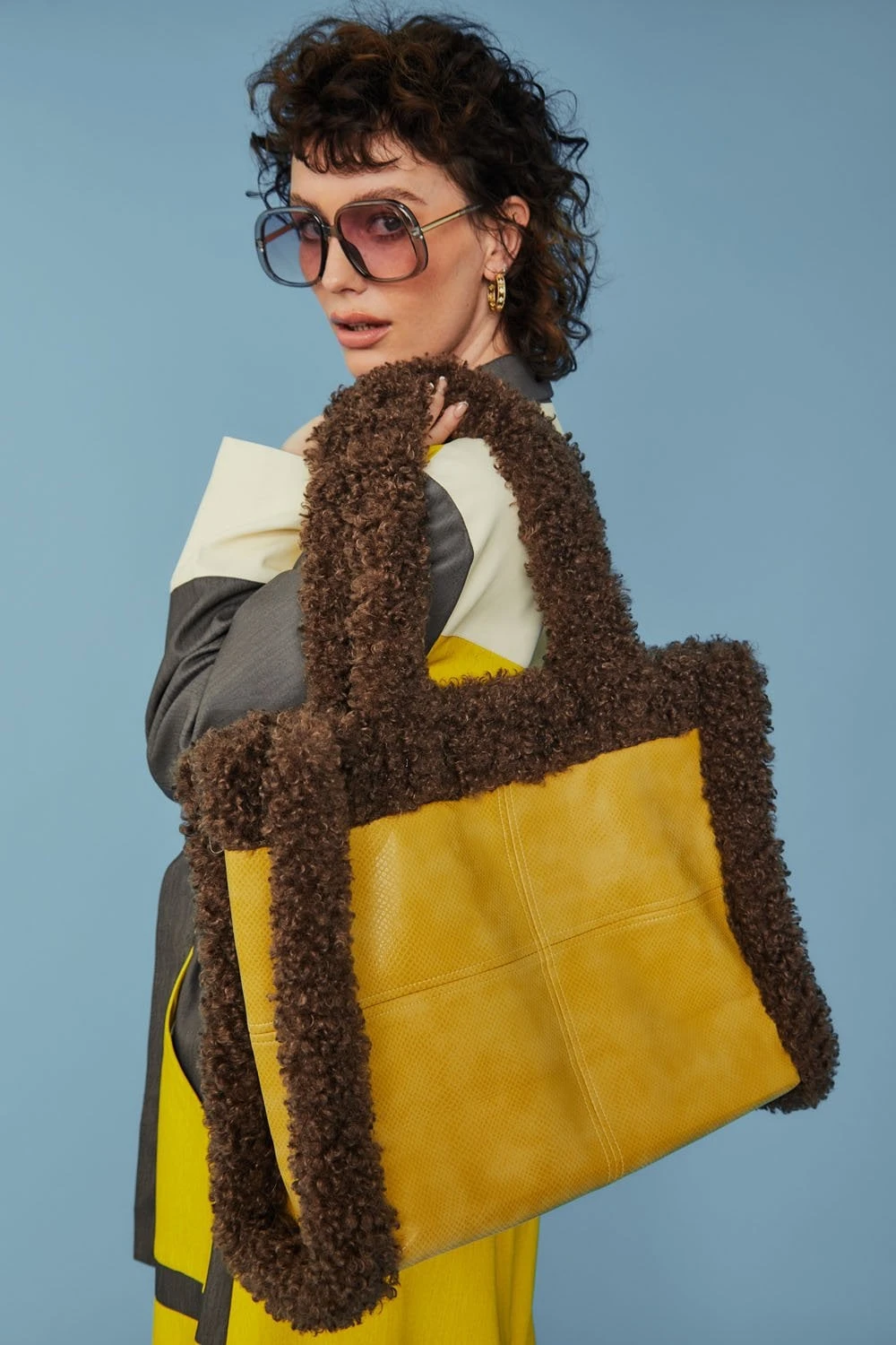 JAYLEY Green And Brown Faux Shearling Large Tote Shopper Bag
