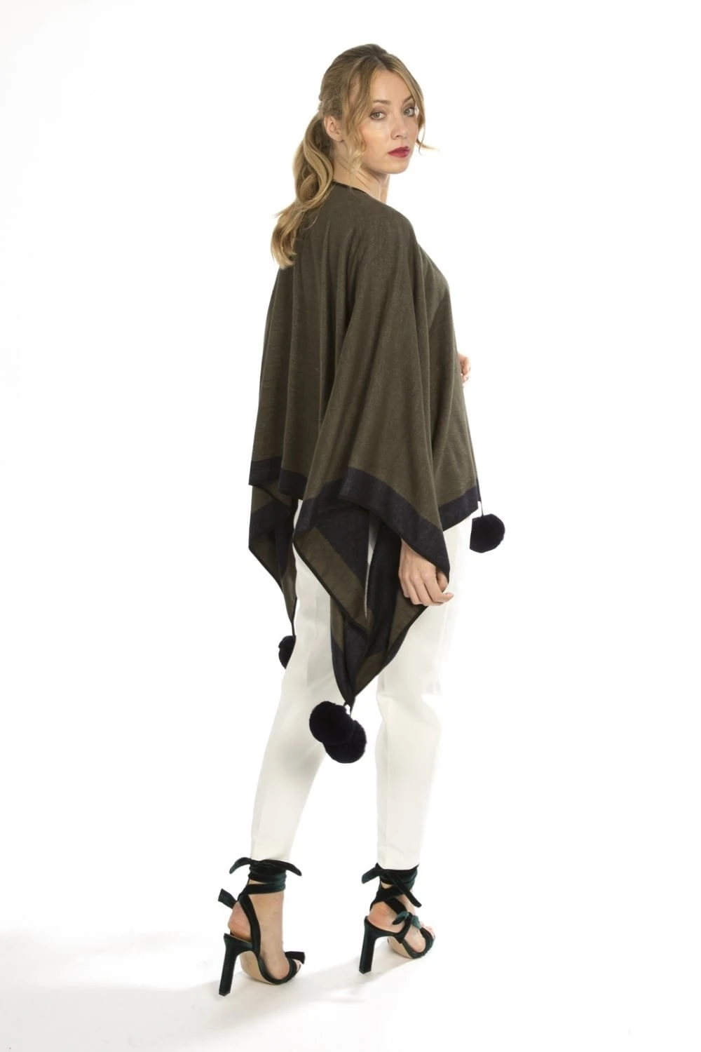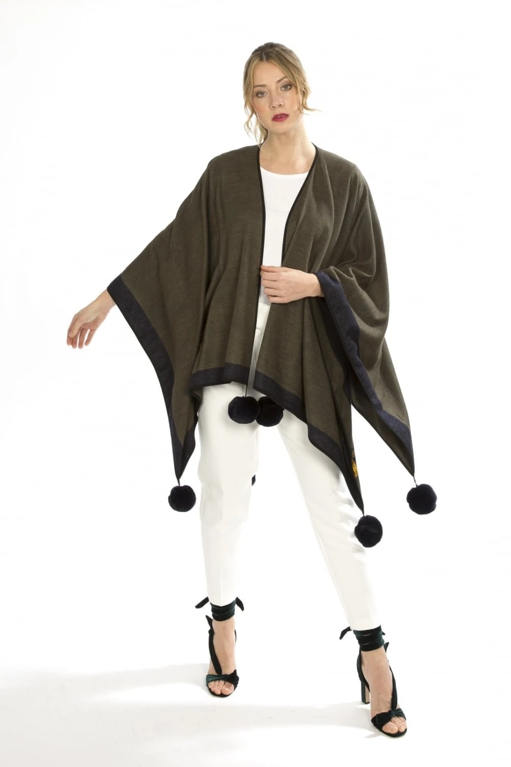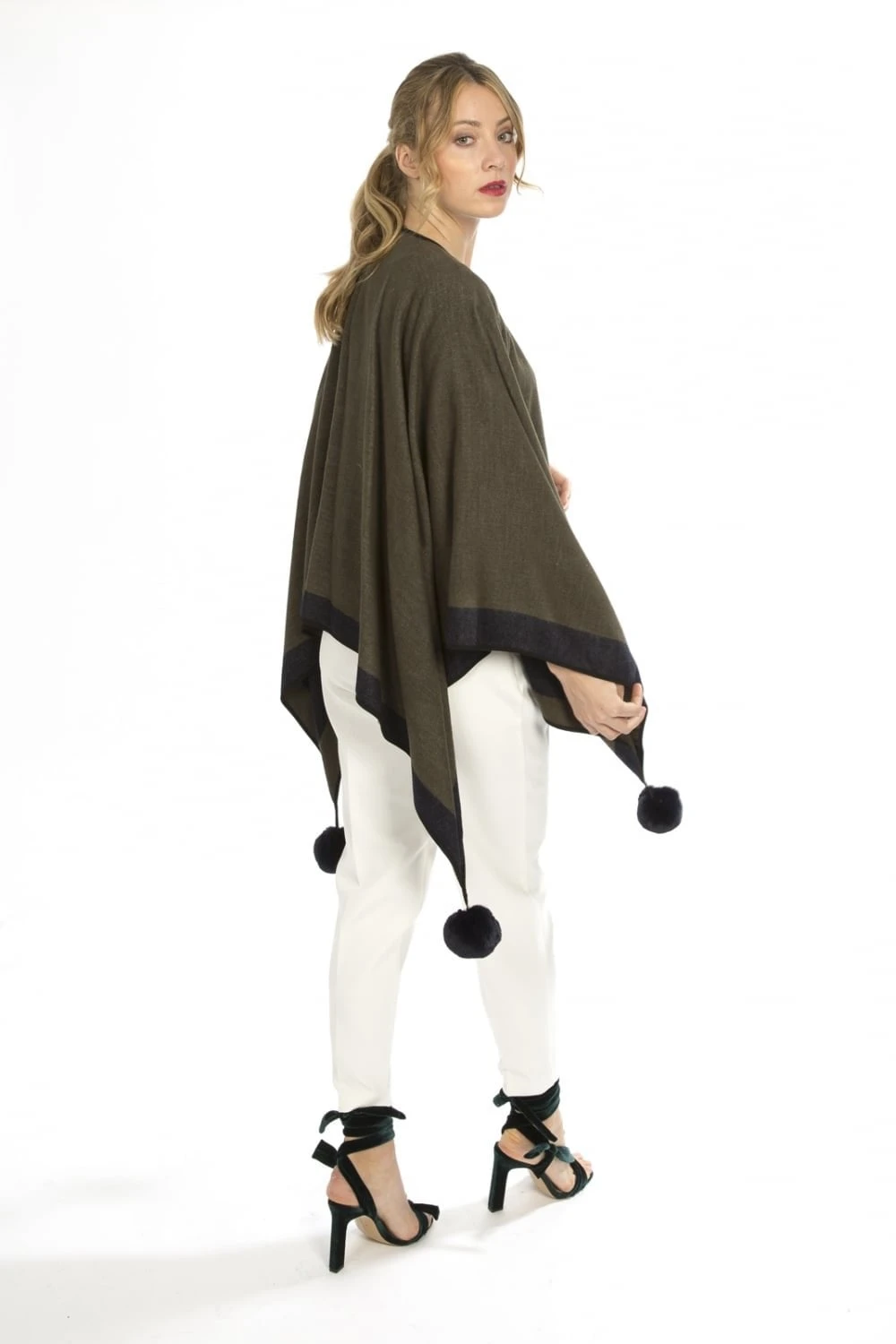 Battle off the cold this season and let your confidence shine in this lovely cashmere cape with faux fur poms, ideal for everyday wear. The perfect layering piece for a cosy winter chic outfit, this cape it’s your most comfortable substitute to a thick jacket. With it’s sleek long line fit, this piece pairs beautifully with a flowing blouse and skinny trousers. Ankle boots will finish a knockout look that will make you look and feel amazingly beautiful.