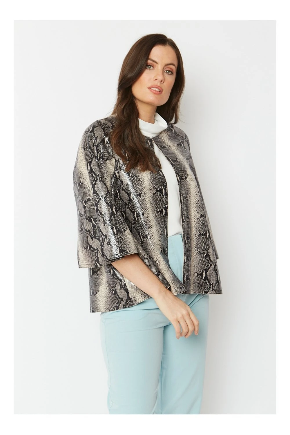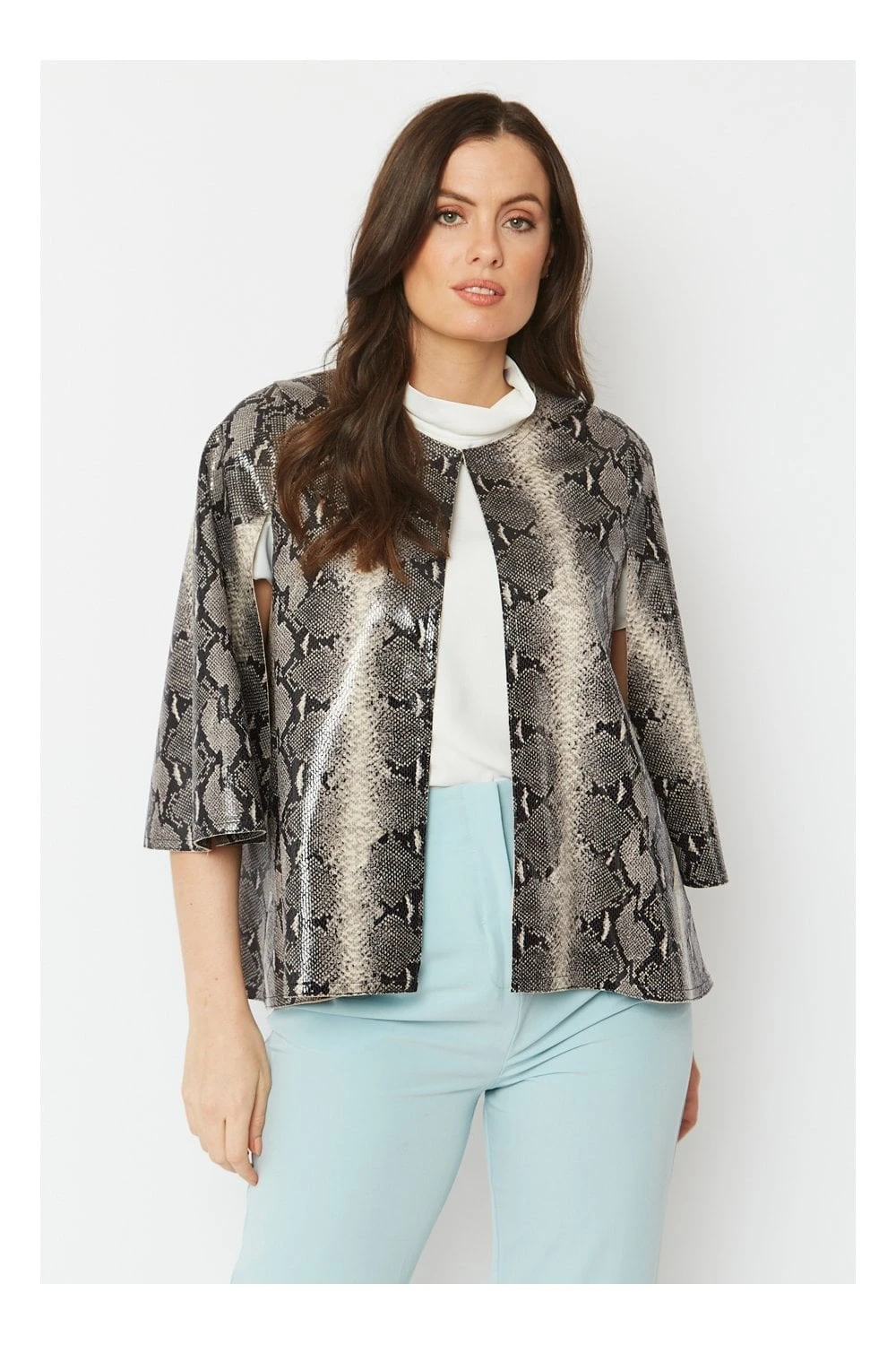 A real statement outerwear piece made from the finest of faux suede materials with subtle snake print. This cape offers a flattering fit with hook and eye front fastening.