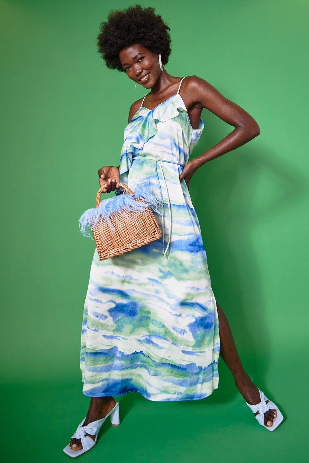 Perfect for your Summer plans this gorgeous cami maxi dress features a ruffle neckline, tie waist and split hem.