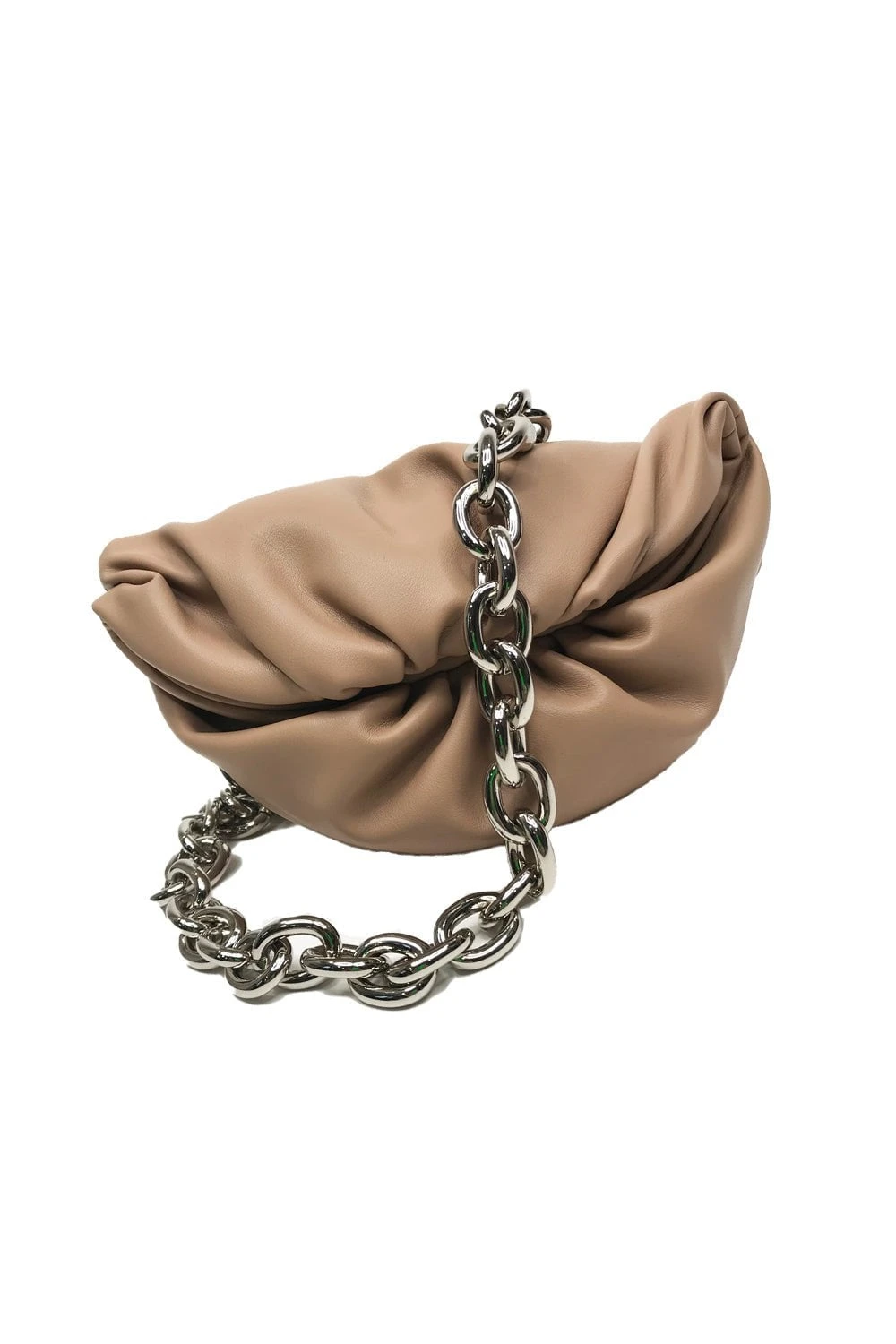 Step out in style with this cute clutch bag with over the shoulder or cross body chain. Featuring magnetic closing and a ruched leather finish.