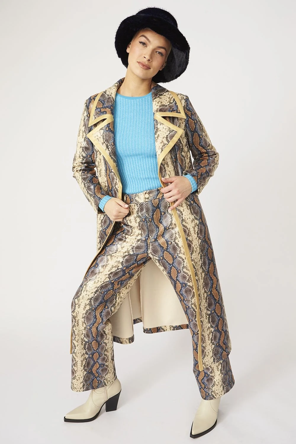 Get ready to make a statement in this unreal hat. Featuring our all-new Bamboo faux minx with mottled blue detail.