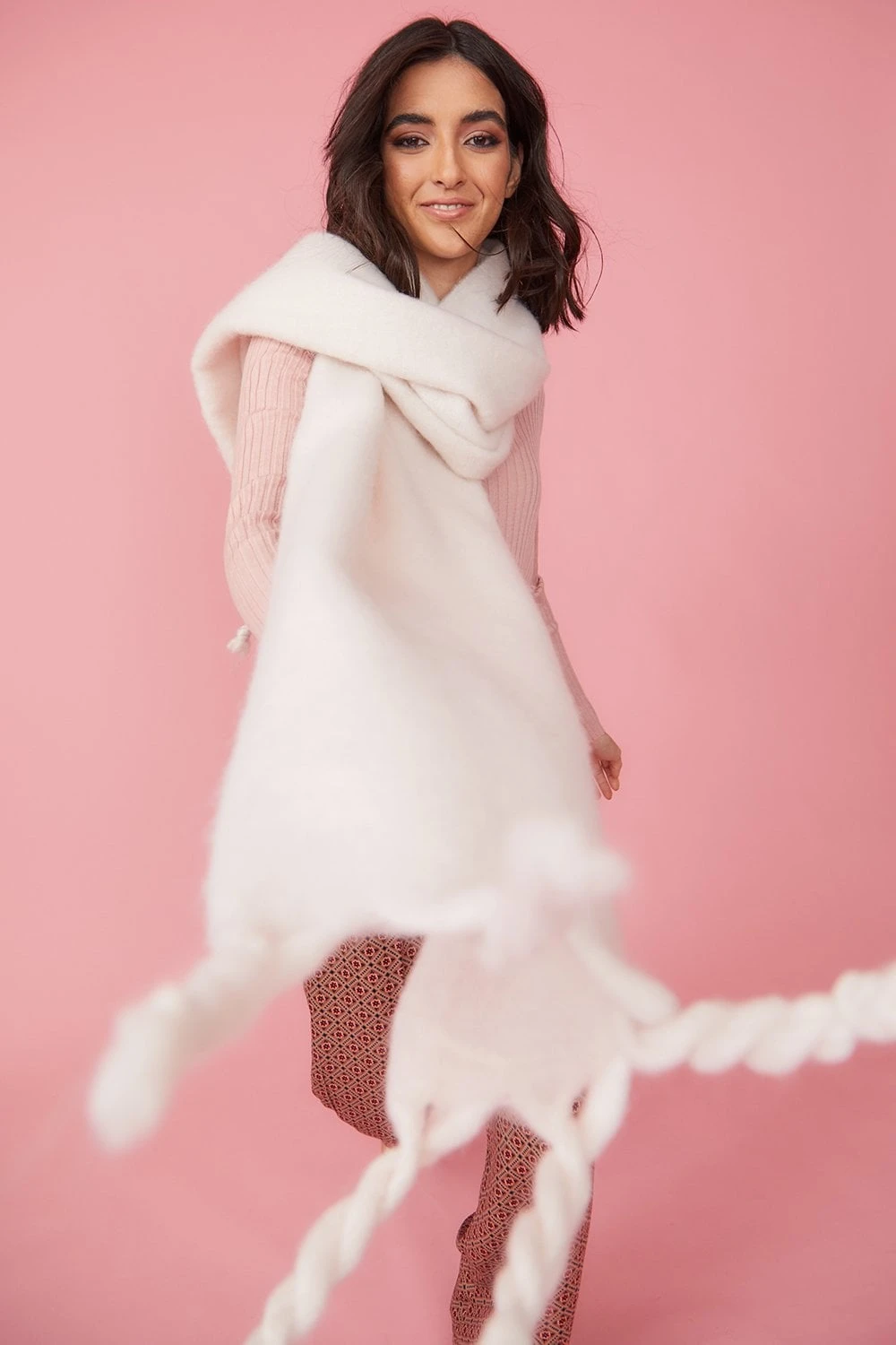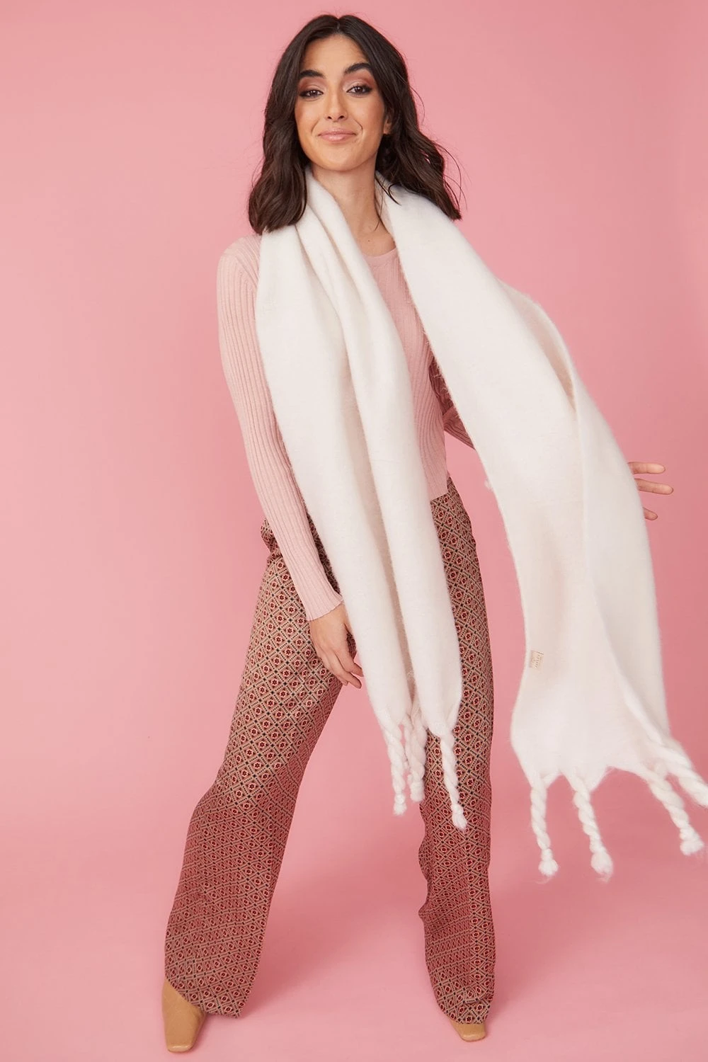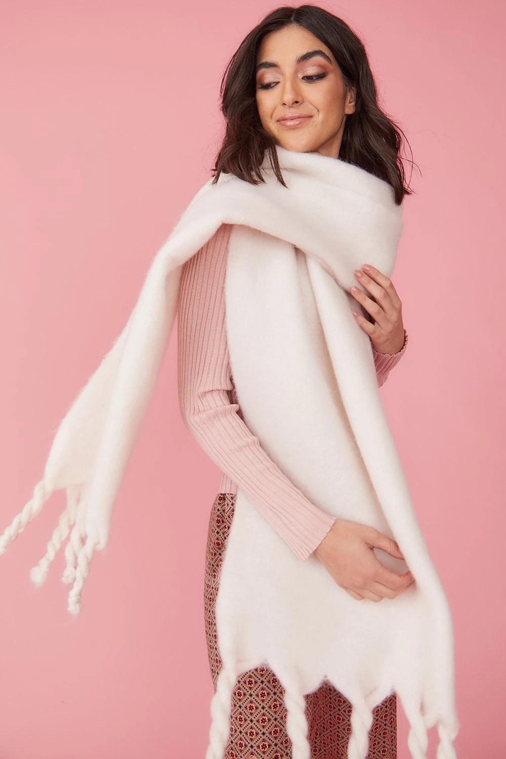This cream cashmere and wool blend oversized scarf are a must-have for this season. Featuring a tassel Trim and brushed wool effect.