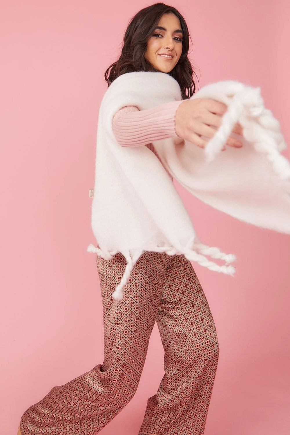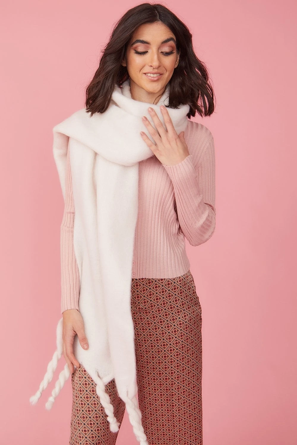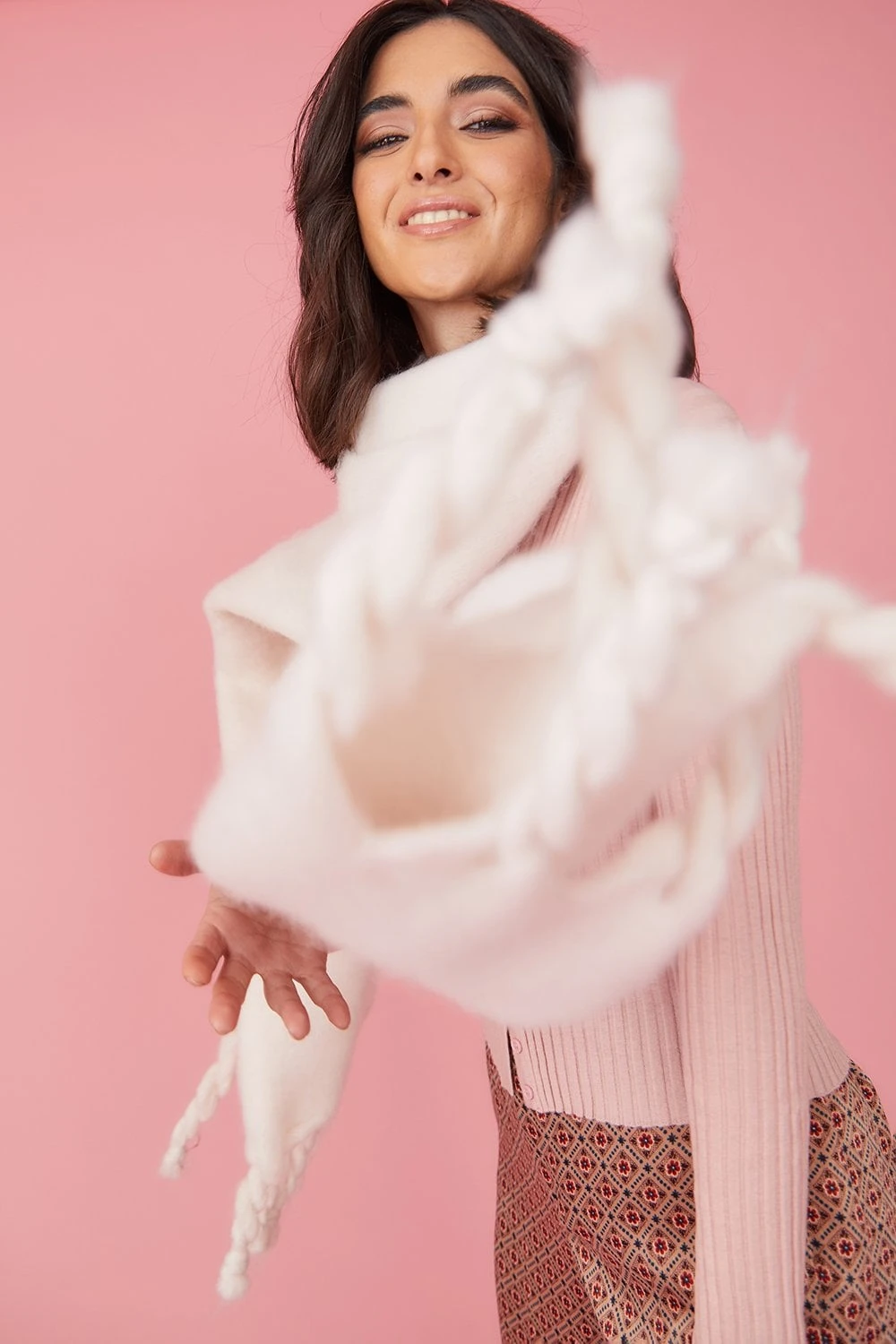 This cream cashmere and wool blend oversized scarf are a must-have for this season. Featuring a tassel Trim and brushed wool effect.