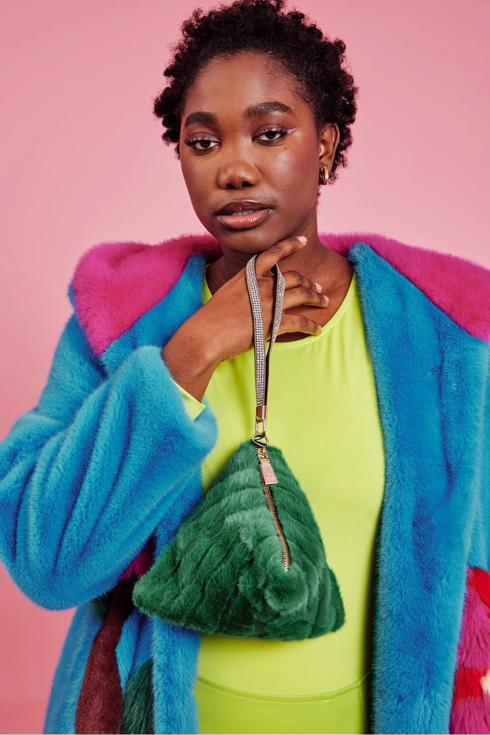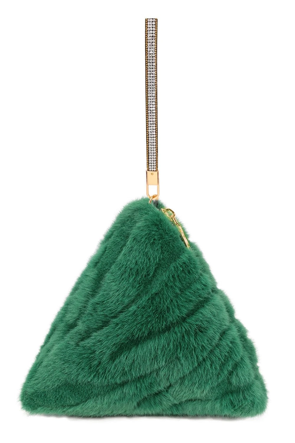 This pyramid faux fur bag features a side zipper, full lining and a removable wrist strap. Available in a variety of colours.