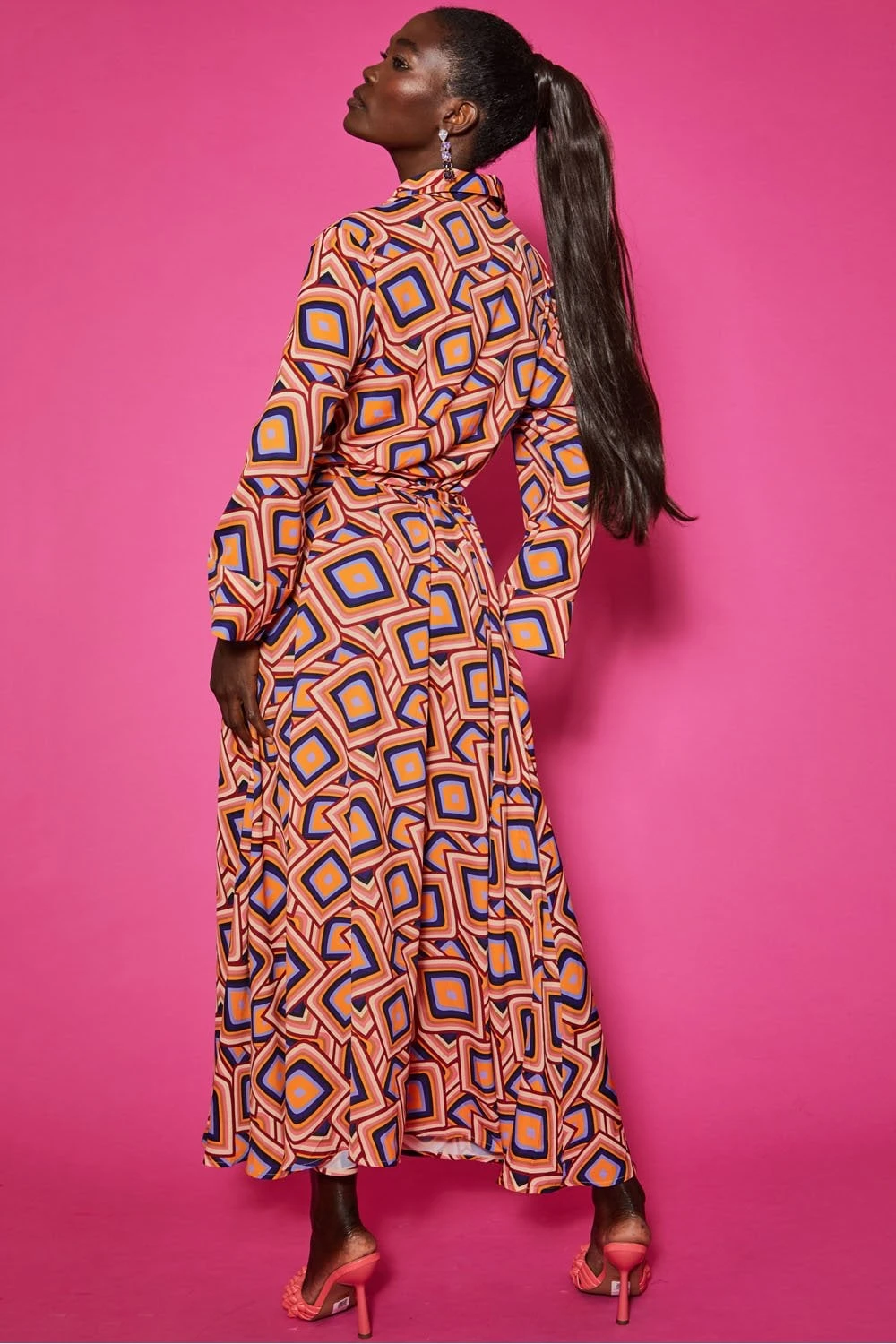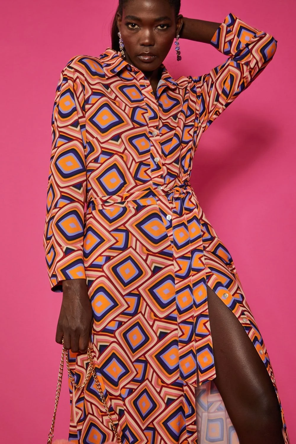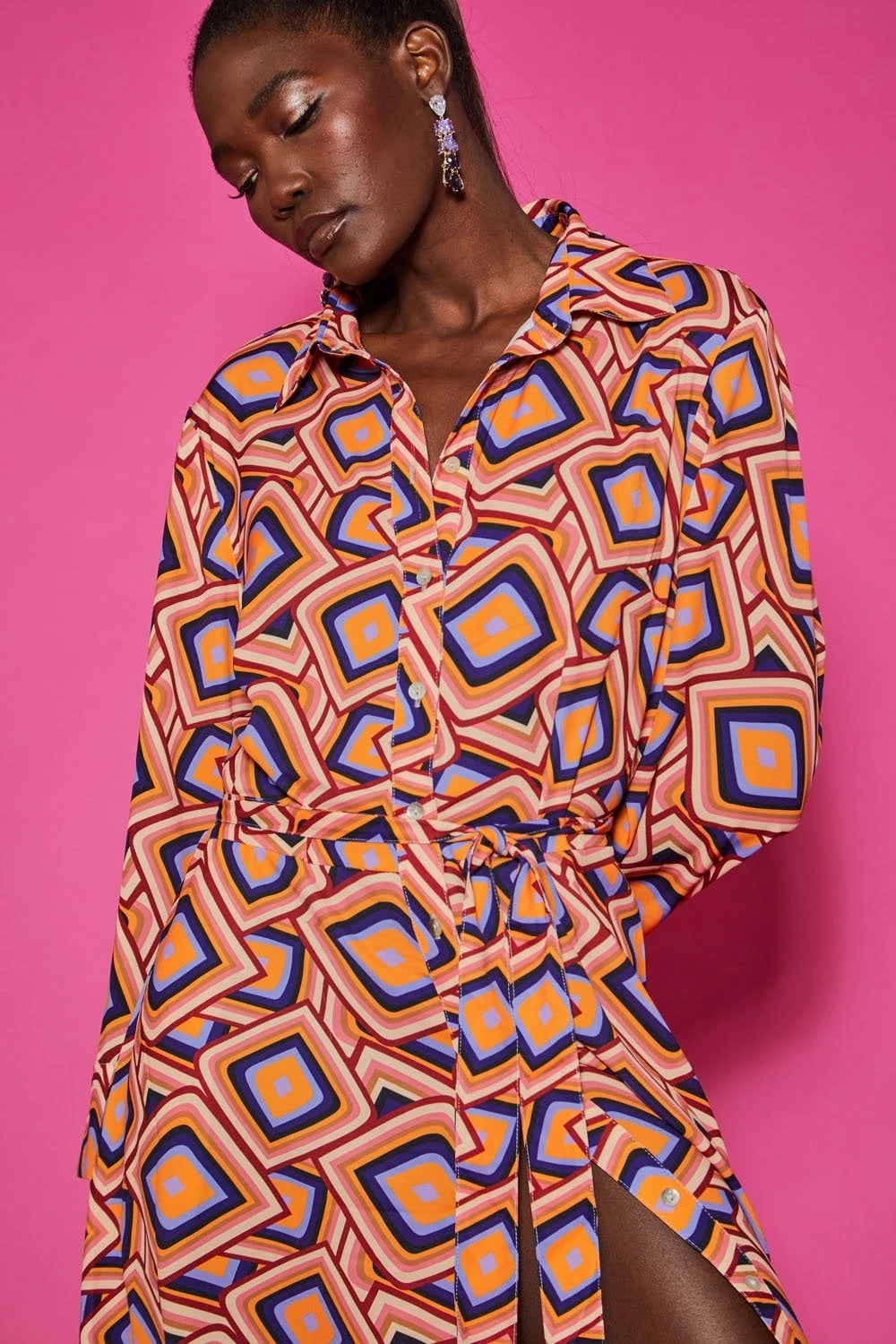 An Autumn must-have, this maxi shirt dress with long sleeves, classic collar, and belted waist is perfect for seeing you through the colder months. Featuring a flattering geometric print and pearl-like buttons.
