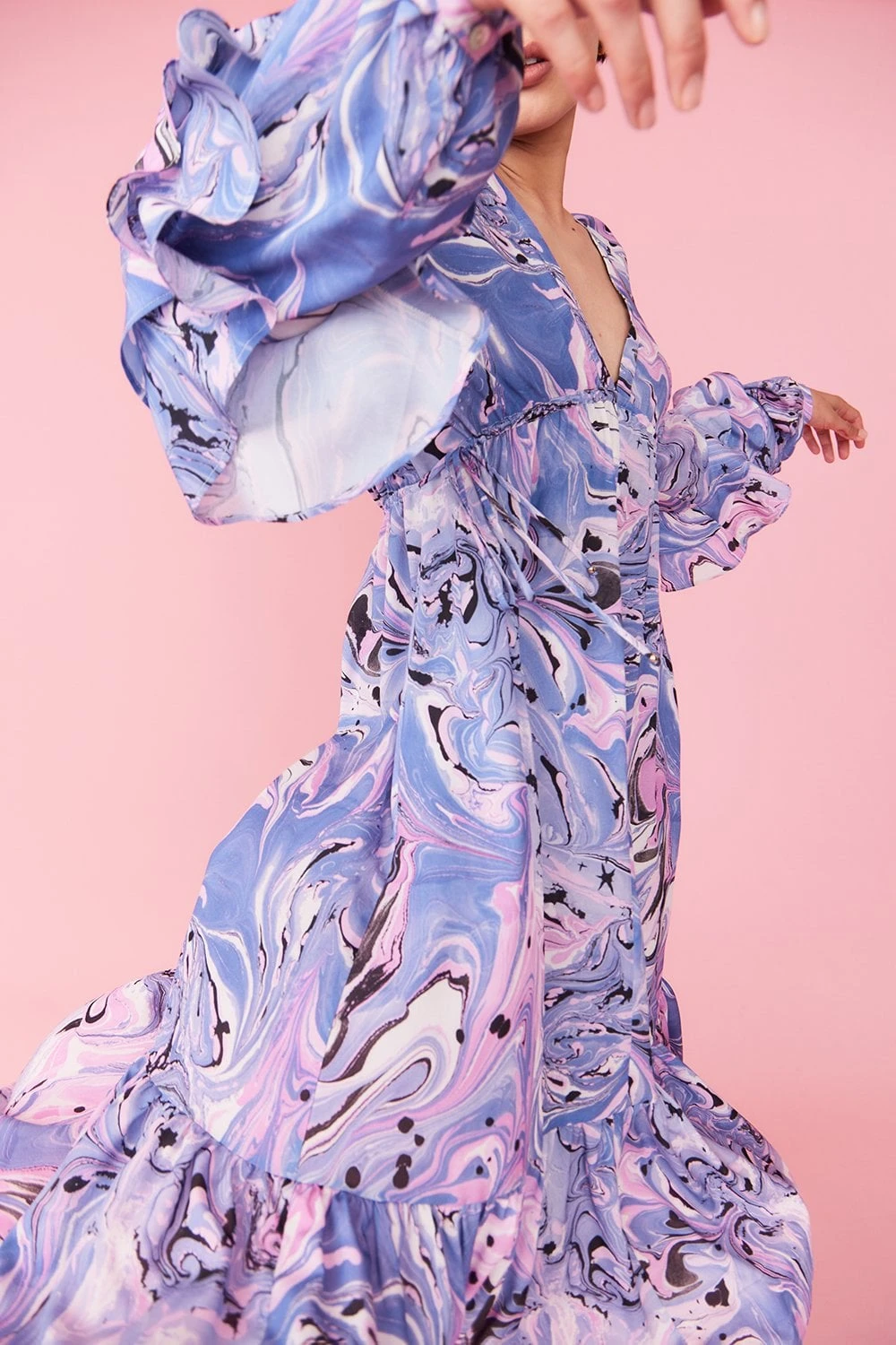 The perfect transitional piece, our purple abstract dress is just what you need for this season. Featuring full-length sleeves and a floaty silhouette and a ruched V neckline. This dress really is the wow factor!