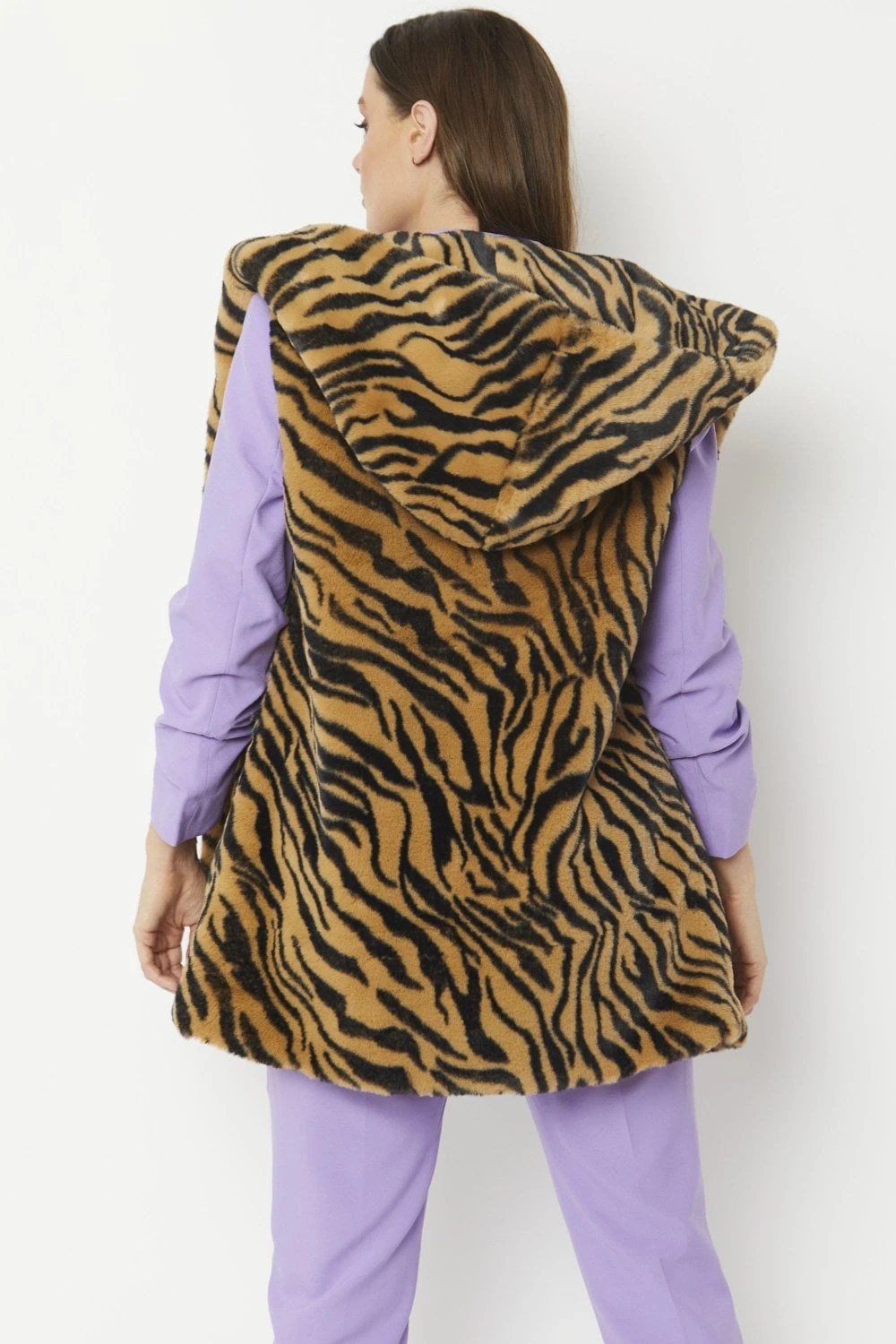 You’ll love this soft faux fur, animal print gilet from Jayley. Featuring an oversized hood which is fully lined with faux fur for extra warmth, working lined pockets and hook and eye fastenings.