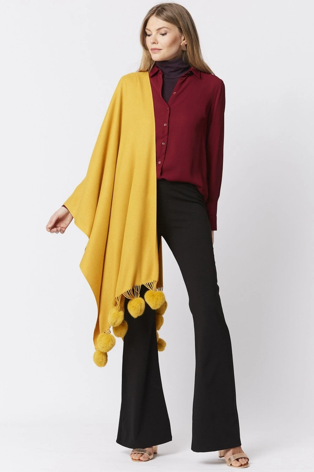 JAYLEY Yellow Cashmere Blend Wrap With Faux Fur Heart Poms